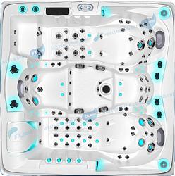 Для каждого места массажные форсунки установлены в индивидуальном порядке, благодаря чему осуществляется воздействие на разные проблемные зоны шеи, спины, икр ног. В конструкции бассейна предусмотрено 33 водных форсунки, их дополняет 10 воздушных форсунок. Силу потока воды каждый пользователь может регулировать для своего места индивидуально.